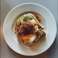 Poached eggs, hummus, sliced avocado, pickled red onions, spicy seed granola, salsa roja on sourdough.