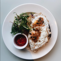 Sourdough with eggs any style, 3fe hot sauce, spicy seed granola & a side salad.