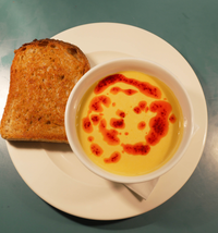 Butternut squash and coconut milk with a touch of fresh ginger, topped with chilli oil, served with a side of toast.