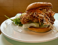 Fried chicken thigh, dressed sesame asian slaw, 3fe hot sauce mayo, in a bap, served with a side salad.