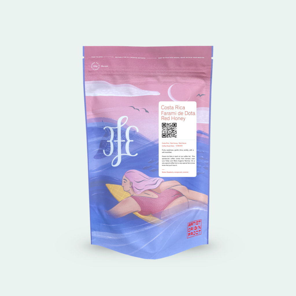 Fruity sweetness, gentle citrus acidity, with a soft mouthfeel. Farami de Dota is back on our coffee list, This spectacular coffee comes from farmers Juan Luis Fallas and Maria Eugenia Ramirez. It's a very special coffee from a very special farm, & we know that you'll love it.
