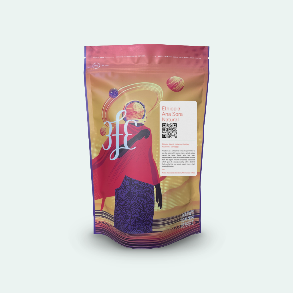 Ana Sora is a fairly rare example of a private estate in Ethiopia, owned by Israel Degfa. It is a relatively new and large farm, sitting at extremely high altitudes near the town of Yirgacheffe. At the moment, all of the coffee on the farm is naturally processed, which gives this coffee a syrupy quality, with many of the exciting flavours common to coffees from this region. Bag Artwork designed by Ethiopian artist, Fanuel Leul.
