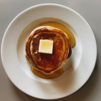 Fluffy pancakes served with 3fe syrup and butter.