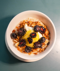 Oats with a lemon curd toppedwith berries, granola & mascarpone.