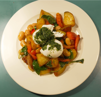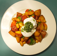 Roasted potatoes, chorizo, redpepper, baby spinach, chipotleheans served with poached eggs.
