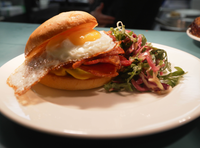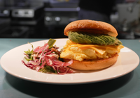 Fried chicken thigh, dressed sesame asian slaw, 3fe hot sauce mayo, in a bap, served with a side salad.